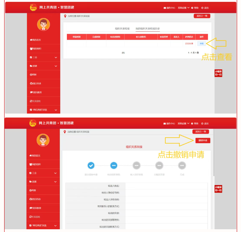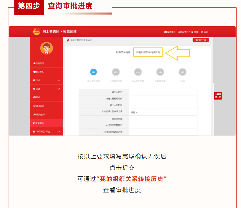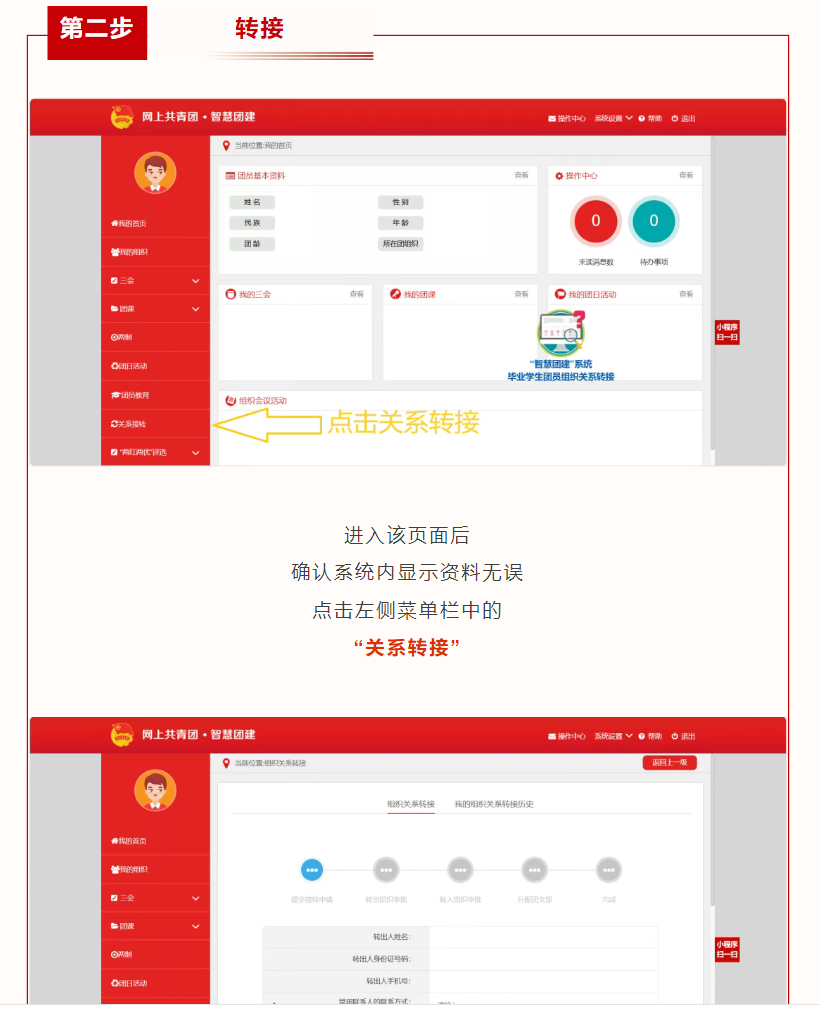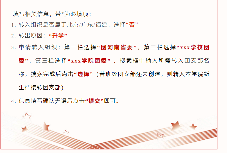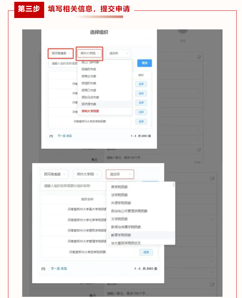 申请转入组织:第一栏选择“团河南省委”;在“搜索关键词处”搜索“郑州财经学院郑州财经学院电子商务学院2025级”;选择所在团支部(例如:25国贸本1班选择“河南省郑州财经学院郑州财经学院电子商务学院2025级国际经济与贸易专业1班团支部”);搜索完成后点击“选择”